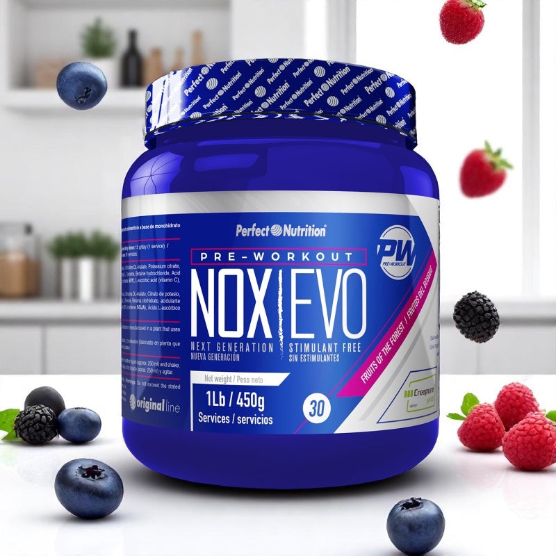 NOX EVO Next Gen es un potente pre-entreno sin estimulantes, ideal para entrenamientos intensos; mejora potencia, fuerza y resistencia sin afectar el sistema nervioso.